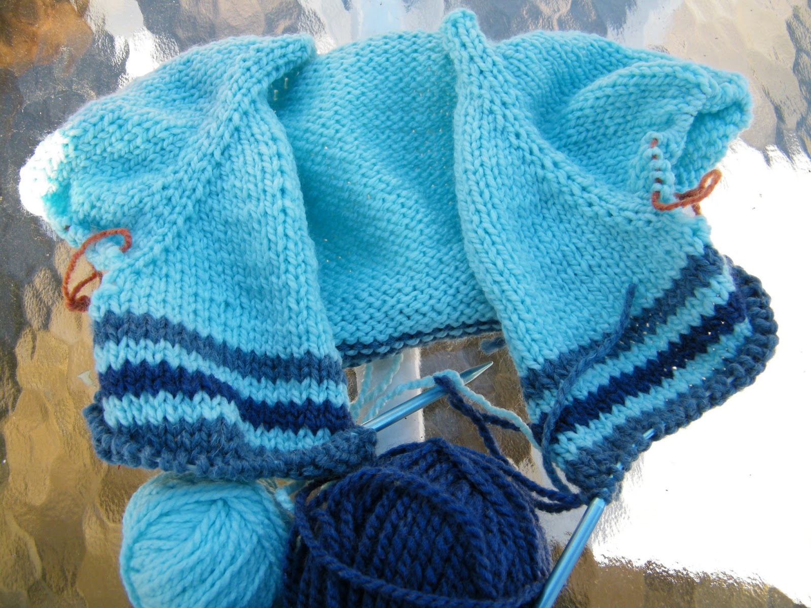 Another of the chunky knit kids' sweaters. I think this one is a little more girly even if it is actual striping rather than a space-dyed yarn. Maybe it's the aqua. The pattern is so easy that I can just save it for my social knitting.